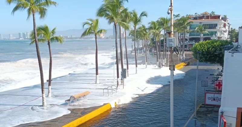 Sergio Ramírez López, director general de la UEPCJ, precisó que el frente más sacudido por el oleaje en Puerto Vallarta abarcó desde el muelle al que arriban los cruceros hasta el malecón. “El agua subió y dejó personas encerradas. Hay algunos negocios y vehículos afectados y el líquido llegó hasta la avenida Medina Ascencio”, relató.